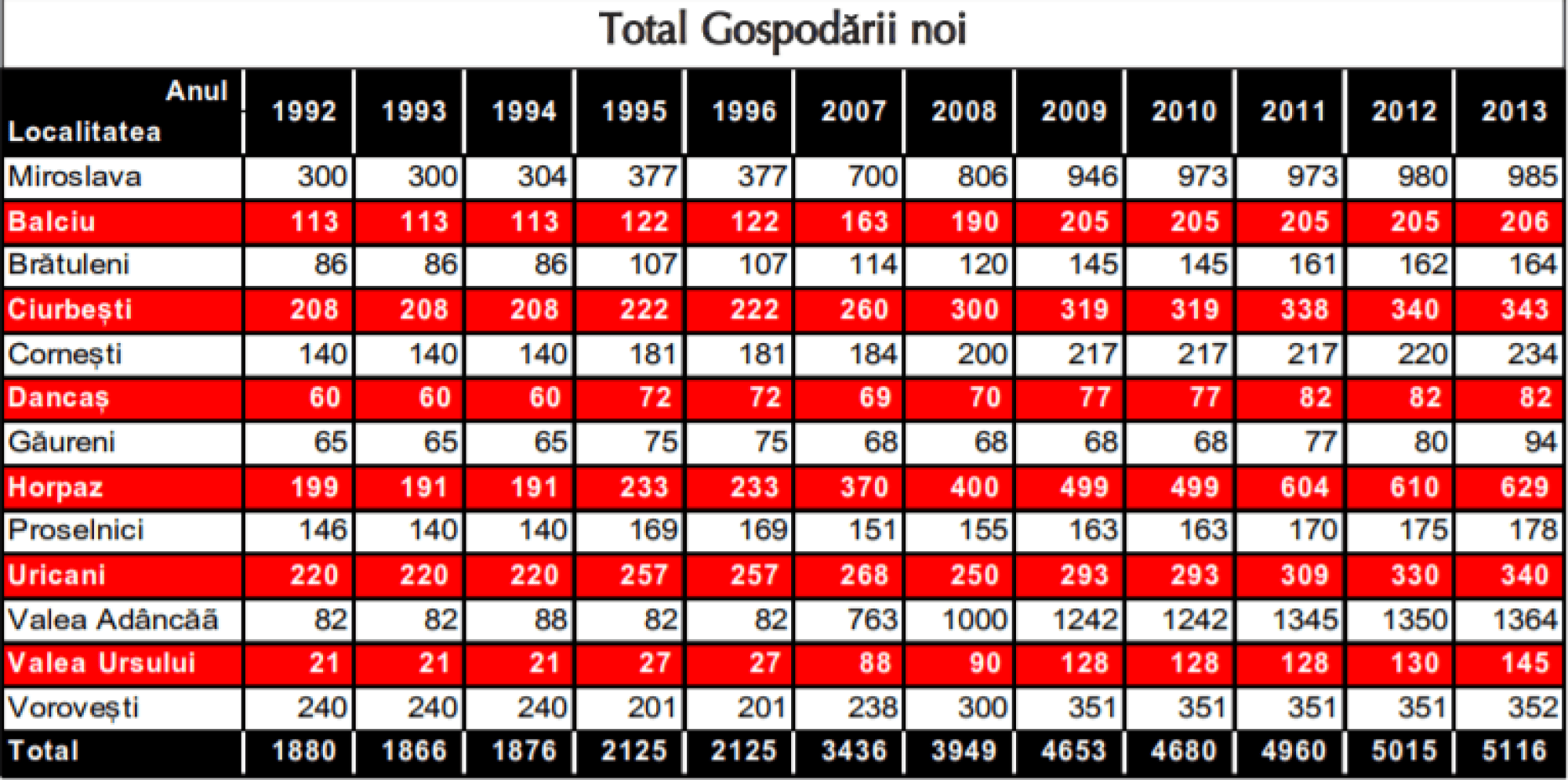 Numărul gospodăriilor este în continuă crestere în toate satele comunei Miroslava. Cea mai spectaculoasă dezvoltare o are satul Valea Adâncă, ale cărui străzi se învecinează cu alte artere ale municipiului Iași. Din 1912 până în prezent, de la 231 la 12.150 de locuitori, populația comunei a crescut de 52,59 ori.